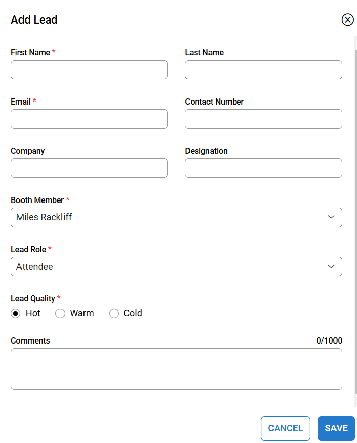 Event app is ZOHO Backstage: Apple or Google. FYI When scanning (item one above needed) or manual entry the following info is filled (automatically) or manually. Booth admins or owners can access all lead lists etc the lead form looks as below also see here.